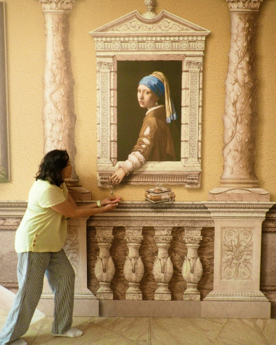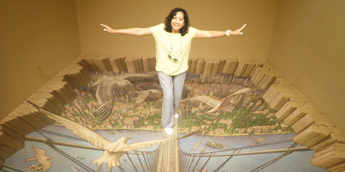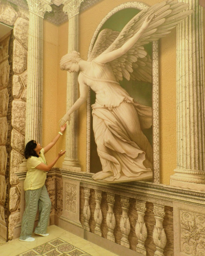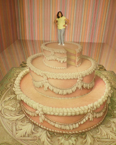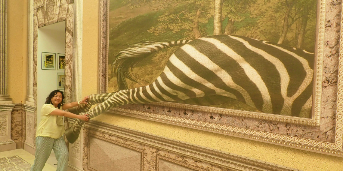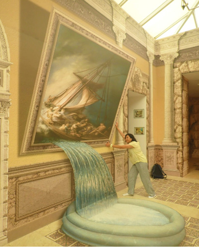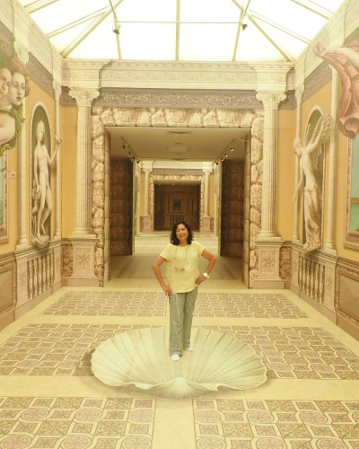 Imagine standing on top of giant cake, posing inside a clam shell and pushing a boat caught in rushing waters. —all within the confines of a museum! Each piece is more than just a painting; it’s an experience that tricks the eye and delights the mind. I am the model here, I can pose and click countless fun photos, making it seem like I am part of the fantastical scenes.