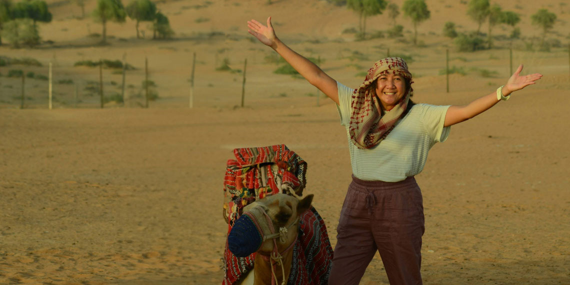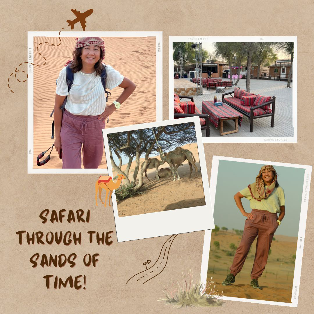 As the sun set, casting golden hues over the desert, we arrived at the camp. Here, the night came alive with a feast for the senses. I indulged in an open buffet that featured a mouth-watering BBQ, delicious local dishes and a variety of local desserts. The evening was filled with captivating performances, including the traditional Tanoura and Khaliji dances. At the camp, there were many items for sale, and I bought a red scarf. The vendor styled it on my head in the Emirati way, and I absolutely loved it.