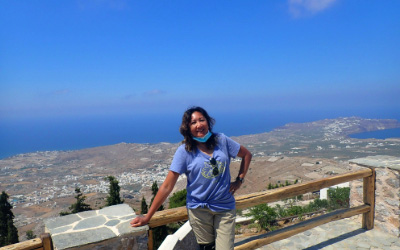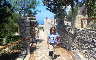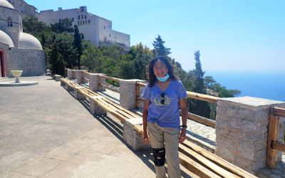 On a hot, windy day, we arrived at the Monastery of Prophet Elias in Thira, Santorini, Greece, following a long and winding road. Despite our anticipation, we were disappointed to find the monastery closed due to the pandemic.