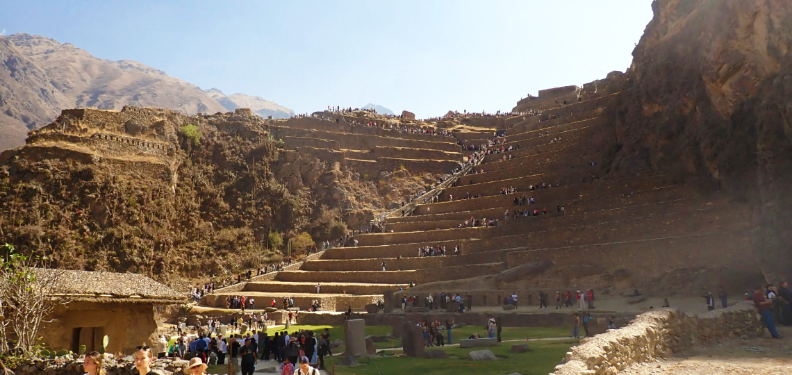 Ollantaytambo was bustling with activity when we arrived, with its parking lot completely filled and some buses even parked far from the site due to the crowd. Our guide emphasized the importance of sticking together as a group, given the influx of tourists that day. He was keenly aware of the potential for anyone to get separated amid the throng.